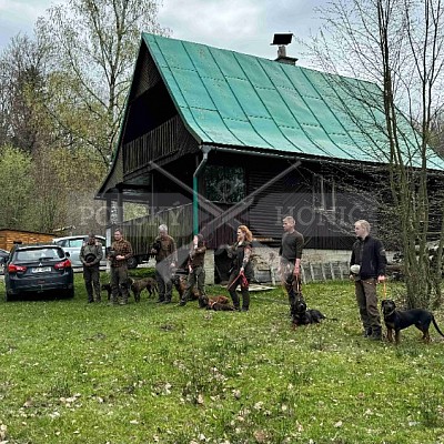 Dne 6.4.2024 jsme se zúčastnili s dvěma polskými honiči výcvikového dne barvářů , kde byli připraveny uměle založené stopní dráhy ve stáří pár hodiny pro nejmladší psy. Starší psi včetně našeho měli stopu starší. Vzhledem k náročnosti terénu a zazvěření této honitby, byla tato disciplína náročná jak pro vůdce tak i pro psy.